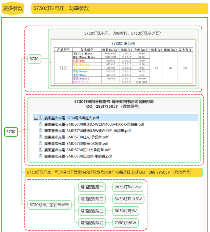 5730灯珠参数,我们主要常用的参数有:功率,电流,电压,波长,规格型号,发光角度和尺寸等。