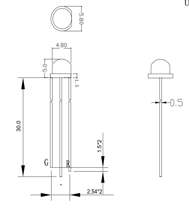 5mm草帽led灯珠三色全彩RGB尺寸图: