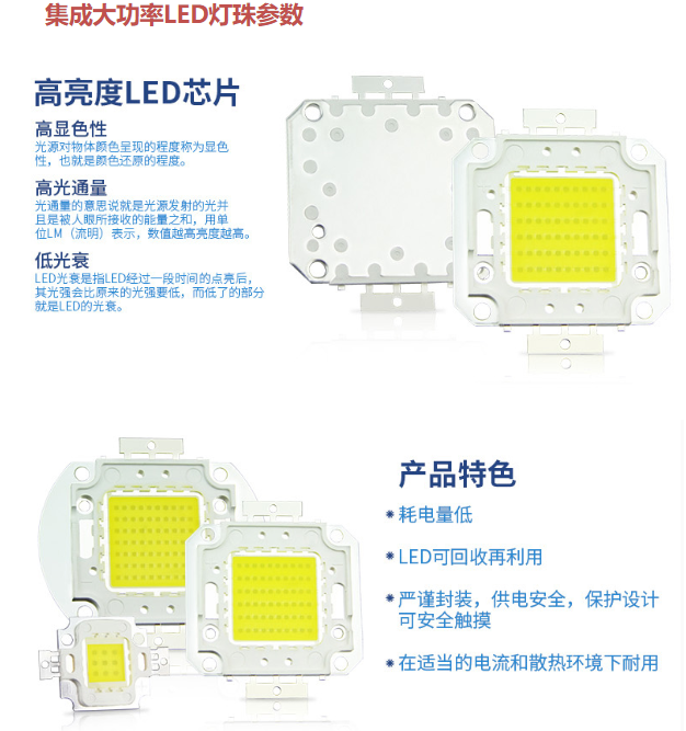 集成大功率Led:10w大功率led, 20w大功率led ,30w大功率led ,40w大功率led,50w大功率led,80w大功率led,100w大功率led等。