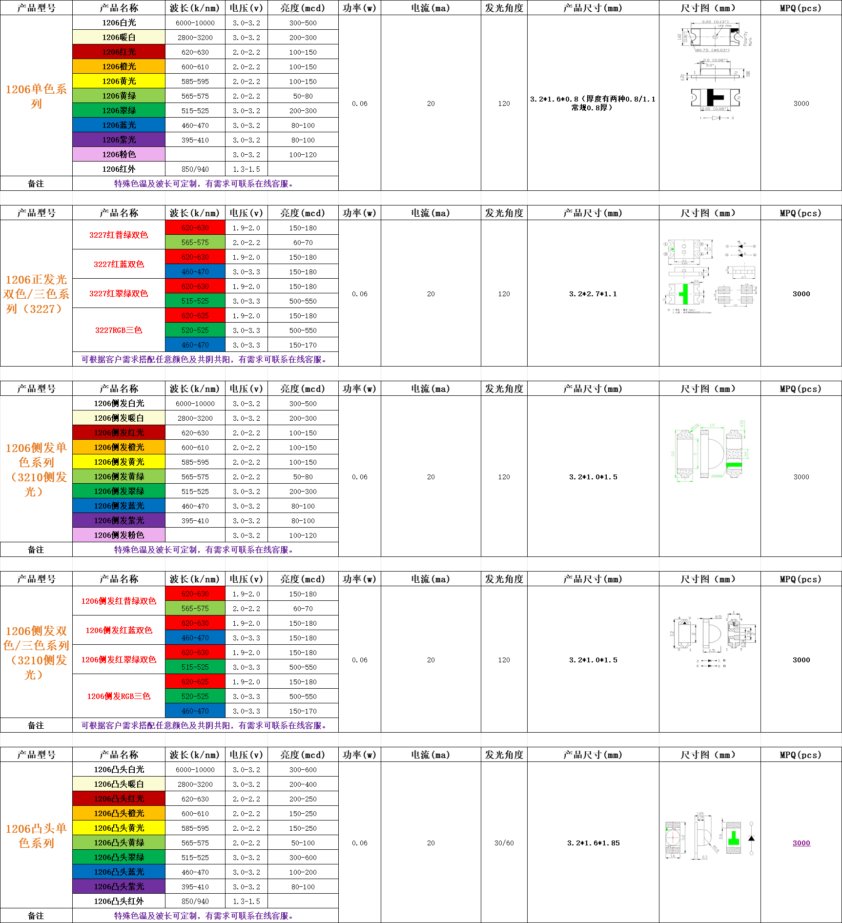 0402贴片灯珠,0603贴片灯珠,0805贴片灯珠,1206贴片灯珠,3528贴片灯珠等。