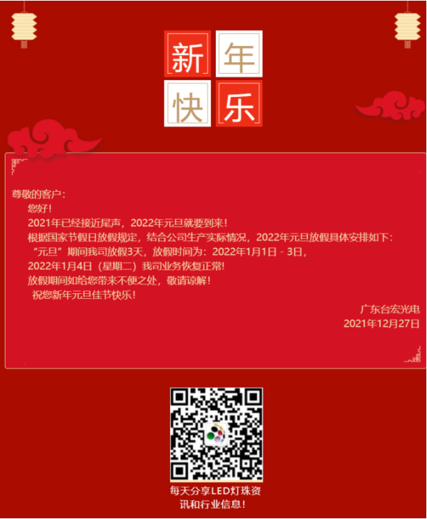 温馨提示:在即将到来的元旦假期,台宏光电建议客户朋友提前做好生产备料准备工作,以免造成因LED灯珠缺料造成不必要的生产损失!