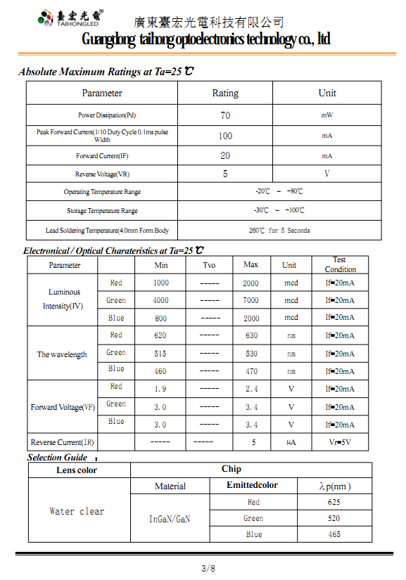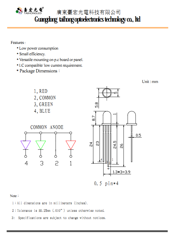 8、台宏RGB灯珠型号 F5mm发光二极管特点: