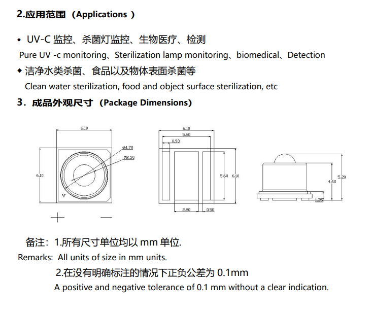 产品应用: ★ 纯 UV-C 监控、杀菌灯监控、生物医疗、检测; ★ 洁净水类杀菌、食品以及物体表面杀菌等。